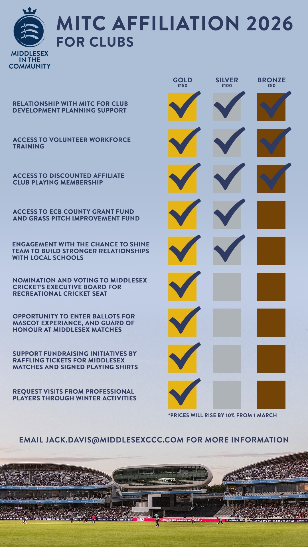 To register your club’s affiliation for 2026, please click on the hyperlinks in the text above to complete the service payment within the Middlesex CCC Shop. You will then receive an automatic confirmation, and our Club Support team will contact you to collect additional information we may require to help us provide enhanced support based on your needs and service level.